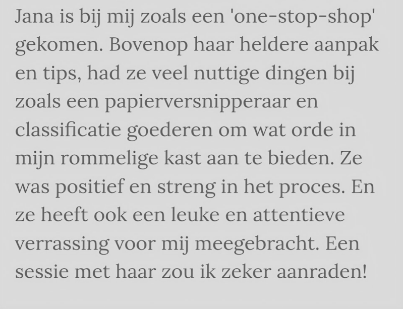 Ik ben een specialist in het aanbrengen van orde en structuur. Ik help jou om vaardigheden te verwerven waar jij zelfstandig mee verder kan. Dit kan gaan van opruimen en structureren tot het opstellen van routines of het beheren van tijd. Ik deel praktische en direct toepasbare tips en zorg daarnaast voor bewustwording. Zo begeleid ik jou op weg naar een meer efficiënte levensstijl.
